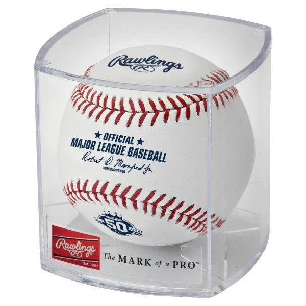 The Kansas City Royals will use this baseball featuring the 50th Anniversary Logo for all home games during the 2018 season. This baseball features the 50th Anniversary logo to commemorate the 50 years of existence for the Kansas City Royals.